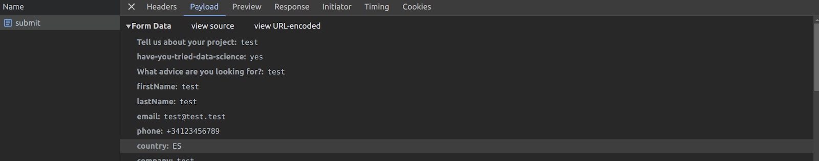 - Fill in the form with test data and submit. You should see the submission in the network tab (it is usually the longest one)