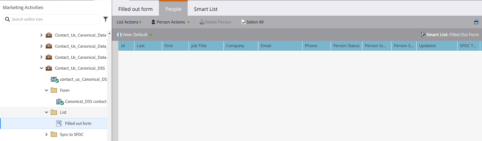 - In the side-navigation there is usually a folder called ‘list’ and within that a file called ‘filled out form’, open this and navigation to the ‘people’ tab. This is where the filled out forms live